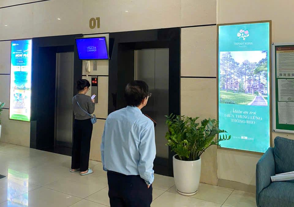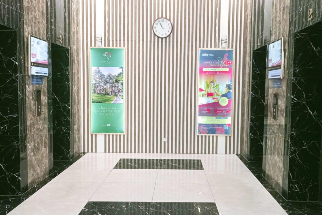 Đồng hành cùng các điểm cầu bộ hành, BIM Group còn tăng độ phủ thương hiệu qua hệ thống Standee Electric Elevator của Note Group đặt tại khu vực thang máy của các tòa nhà chung cư, văn phòng trung tâm Hà Nội. Đây là một trong những không gian cao cấp, tiếp cận trực tiếp nhóm khách hàng mục tiêu gồm giới chuyên gia, doanh nhân, cư dân cao cấp – những người đang tìm kiếm một chuẩn sống mới: riêng tư, gần gũi thiên nhiên và đậm chất nghỉ dưỡng lâu dài.