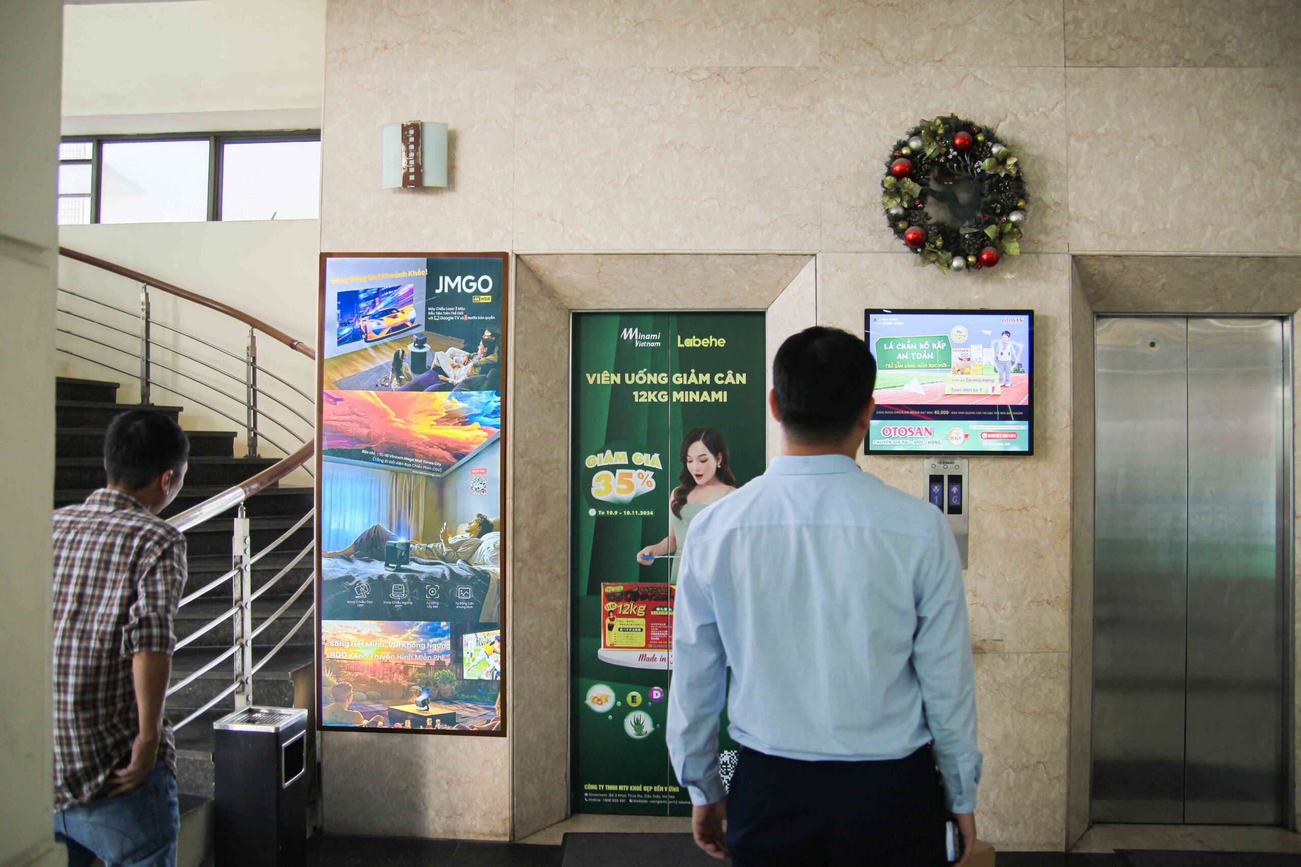 - Loại hình quảng cáo: dán decal cửa thang máy, đặt standee…